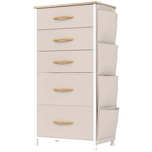 YITAHOME Commode, 5 Tiroirs en Tissu Commode Chambre Meuble de Rangement avec Poches latérales et Crochets,Cadre en Métal,pour Chambre à Coucher, Salon,Beige