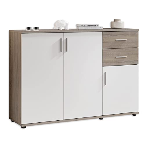 Commode meuble de rangement avec 2 portes et 2 tiroirs coloris chêne Artisan /blanc - longueur 120 x profondeur 30 x hauteur 77 cm
