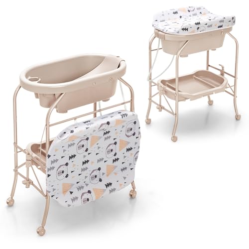 COSTWAY Table à Langer 2 en 1 avec Baignoire 20L Plateau de Rangement, Commode à Langer Pliable Couches Étanches Roue Universelle à Frein Baignoire Charge 35KG, pour Bébé 0-12 Mois (Beige)
