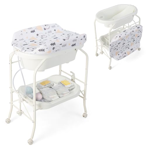 COSTWAY Table à Langer 2 en 1 avec Baignoire 20L Plateau de Rangement, Commode à Langer Pliable Couches Étanches Roue Universelle à Frein Charge 35KG, pour Bébé 0-12 Mois (Blanc)