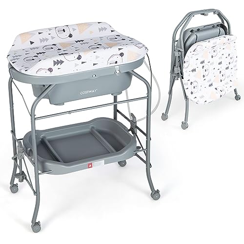 COSTWAY Table à Langer 2 en 1 avec Baignoire 20L Plateau de Rangement, Commode à Langer Pliable Couches Étanches Roue Universelle à Frein Baignoire Charge 35KG, pour Bébé 0-12 Mois (Gris)