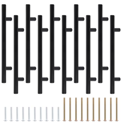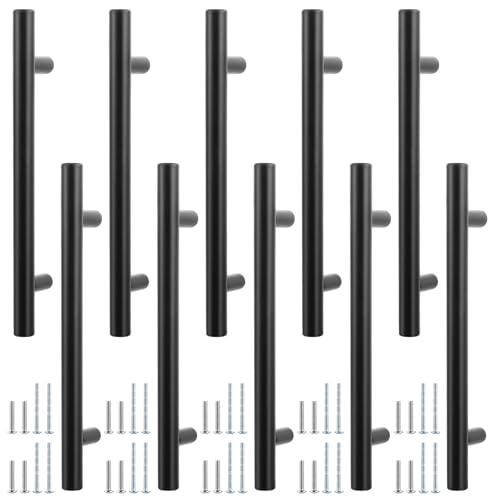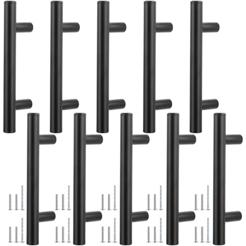 ASelected Lot de 10 poignées de porte de placard de cuisine, 127 mm, noir, espacement des trous de 76 mm, poignées en T en acier inoxydable avec vis pour armoire, commode, porte, portail, armoires et