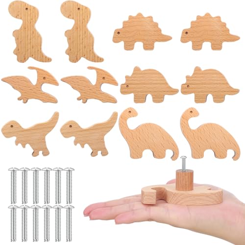 Qunclay Lot de 6 boutons d'armoire décoratifs en bois avec vis, poignées de commode, boutons de commode, boutons de meubles, poignées de tiroir de chambre d'enfant (dinosaure)