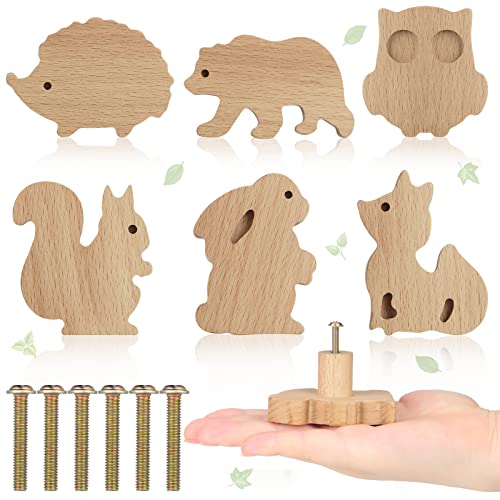 Qunclay Lot de 6 Boutons d'Armoire Décoratifs en Bois avec Vis, Poignées de Commode et Tiroir de Chambre d'Enfant (Animal de la Forêt)