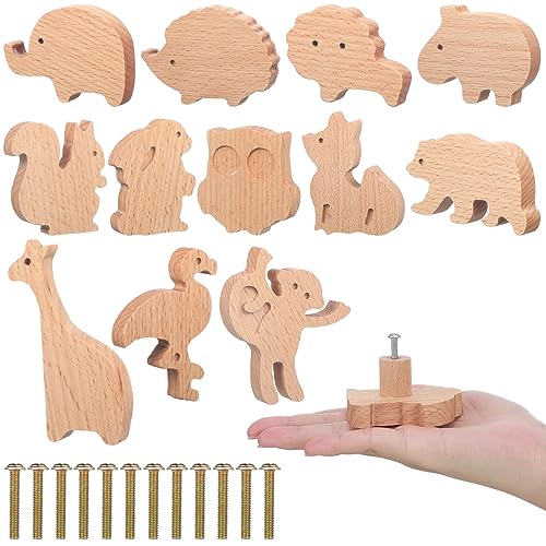 Qunclay Lot de 12 boutons d'armoire décoratifs en bois avec vis, poignées de commode, boutons de commode, boutons de meubles, poignées de tiroir de chambre d'enfant pour décoration (zoo)