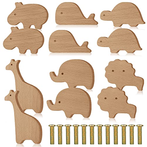 Qunclay Lot de 12 boutons d'armoire en bois en forme d’animaux marins et de la forêt, boutons décoratifs de commode en bois avec vis, poignées de tiroir de chambre d'enfant pour la décoration