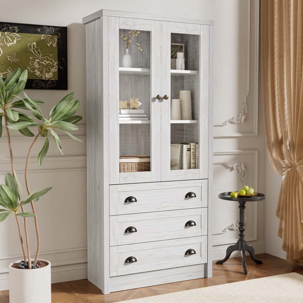 Commodes AIORBER, avec portes vitrées, 3 tiroirs & poignées élégantes en cuivre, armoire Highboard, 80 x 34 x 171 cm, pour salon, bureau & entrée, couleur bois