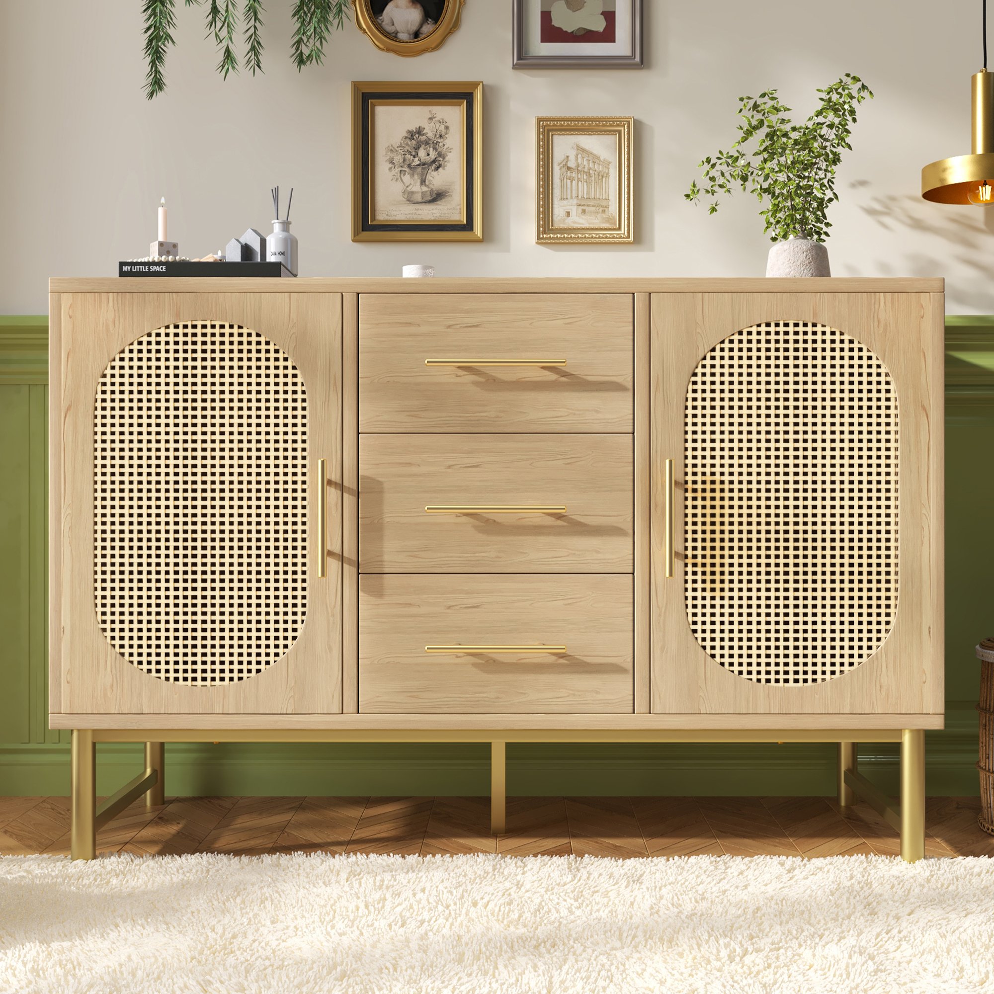 Flieks Commodes Armoire de salon en rotin, Sideboard avec 3 tiroirs et 2 portes, commode à tiroirs buffet avec pieds en métal, 120cm, naturel