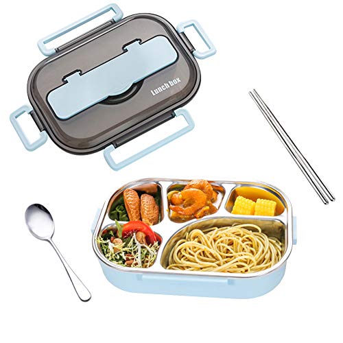 amropi Bento Box Lunch Box en Acier Inoxydable avec 2/3/4/5 Compartiments avec Baguettes, cuillère pour Enfants Adultes, Passe au Lave-Vaisselle (Bleu, 4 Compartiments)