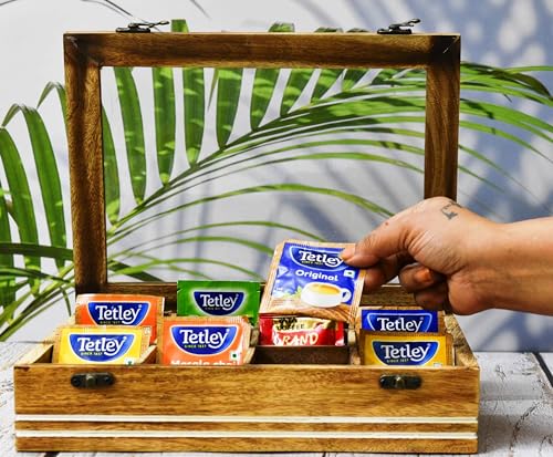 Boîte à thé en bois India House - Boîte à thé pour sachets de thé - Coffre à thé en bois dur gravé avec 6 compartiments - Boîte de rangement multifonction - 25,4 x 15,2 x 10 cm
