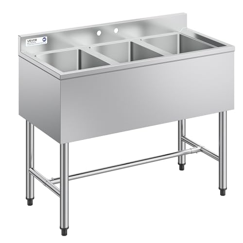 VEVOR Évier de Cuisine à 3 Cuves de 35,6x40x27,9 cm, Évier Autoportant sur Pied, pour Restaurant Bar Camion-restaurant Maison, en Acier Inoxydable 304 de Calibre 18, avec 2 Égouttoirs et Dosseret