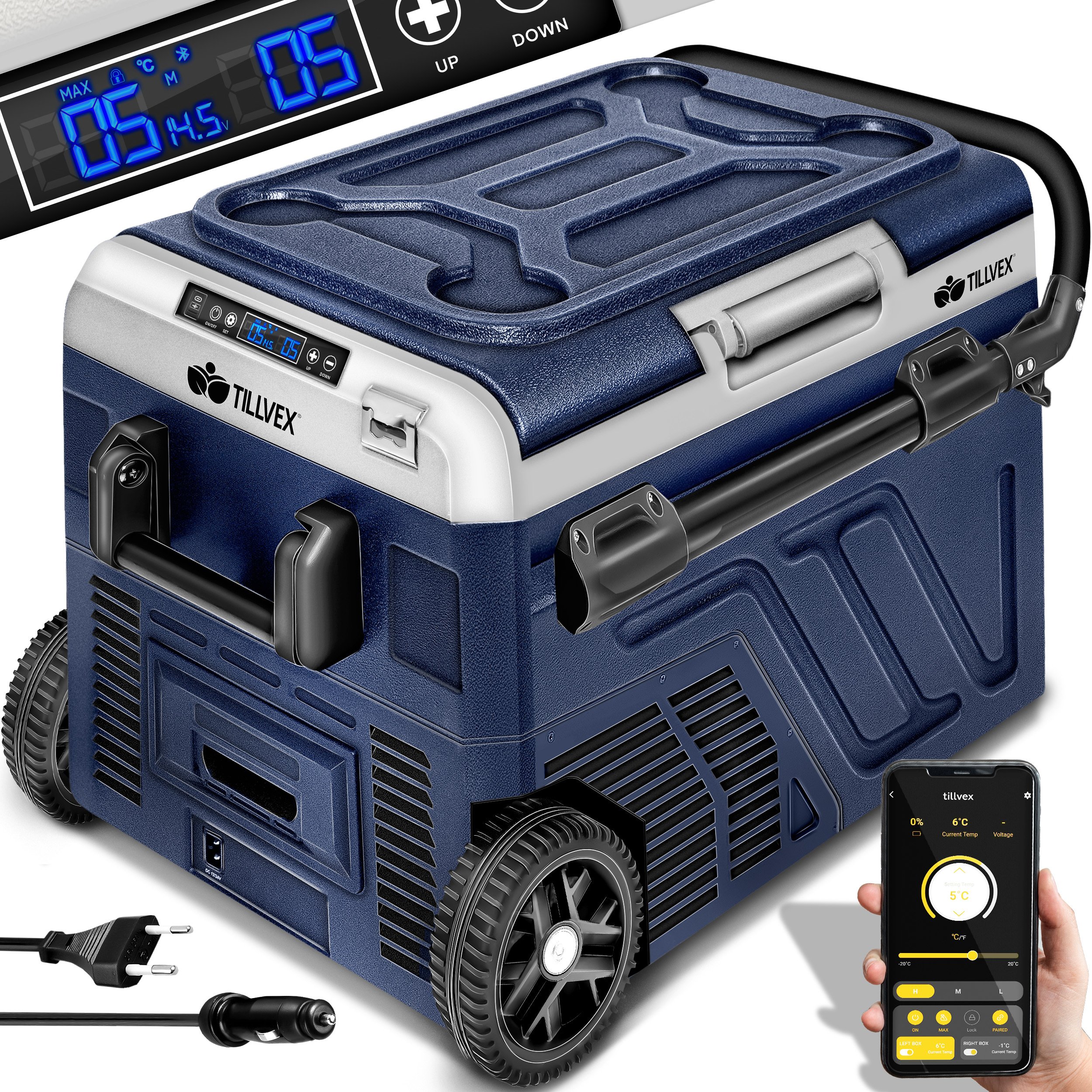 tillvex® Glacière à compresseur électrique 60 litres / Bleu marine | Glacière électrique avec APP &Smart, LCD-Touch, connexion USB 12/24 V 230V | Réfrigérateur jusqu'à -20 °C voiture, camion, bateau, camping-car, camping-car
