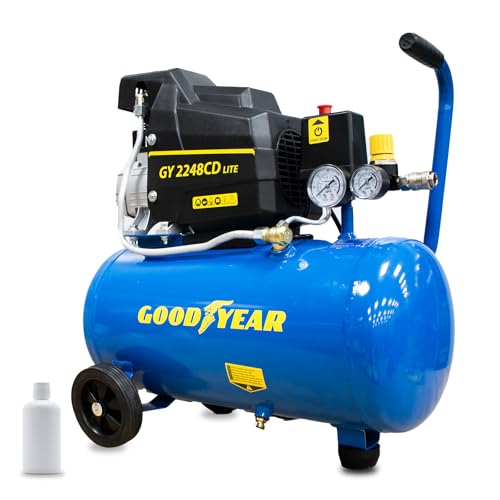 Compresseur électrique Goodyear - 24 litres 2 CV Moteur à induction 230 V - 50 Hz. Compresseur 165 litres/minute Capacité d'aspiration. 2 800 tr/min. Pression nominale 8 bars. 97 dB