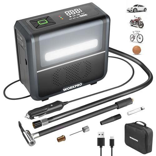 WORKPRO Compresseur à Air Portatif 12 V, Gonfleur Pneu Voiture avec Batterie 2500 × 3 mAh, Gonfleur Electrique 150 PSI, 5 Modes de Gonflage pour Pneus de Voiture Velo Ballon Moto Matelas Gonflable