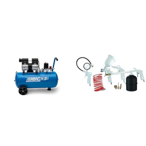 ABAC Compresseur d'Air Silencieux EASE-AIR 50, Compresseur d'Air sans Huile, Pression Maximale 8 Bar & Kit d'Accessoire Compresseur 8 Pièces G-810P, Comprenant Gonfleur de Pneus avec Manomètre