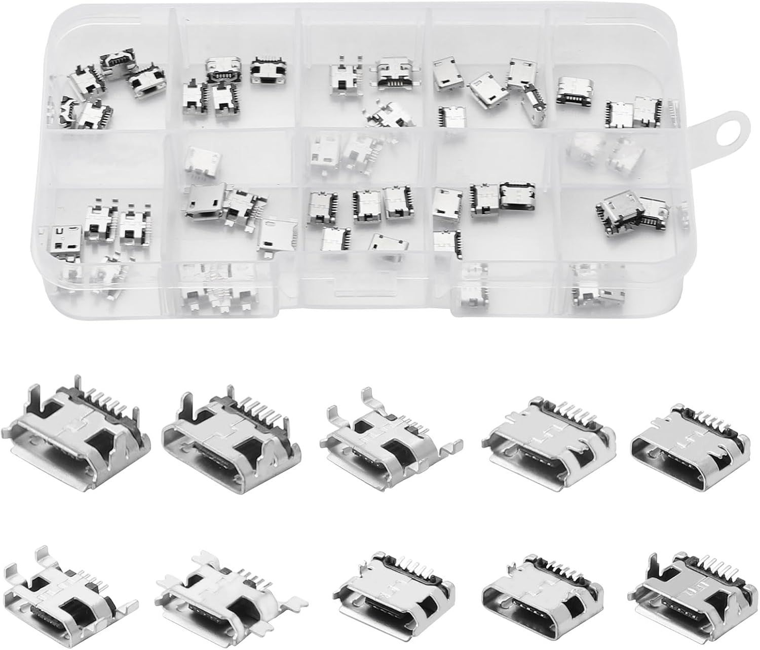 HENGBIRD 50 Pièces Micro USB A Souder Femelle 10 Odèles 5pcs de Chaque Type de Connecteur USB Set pour Connecteur Electronique I'équipement
