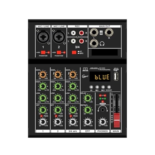 Lazmin112 Mélangeur de Son 4 Canaux, Console de Mixage avec Alimentation Fantôme 48 V avec Processeur de Signal Numérique 99 Bits et égaliseur 7 Bandes, pour DJ (Prise UE)