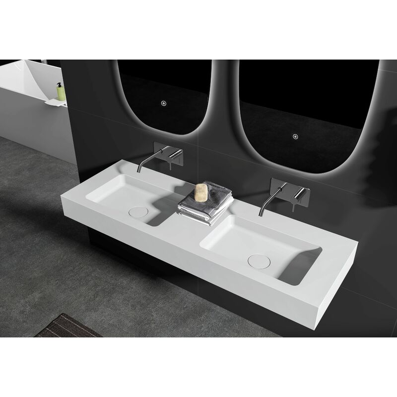 Double Vasque murale suspendue design en fonte minérale pour salle de bain avec bonde et trop plein - 133x45x12 cm - BA8013 - couleur et console