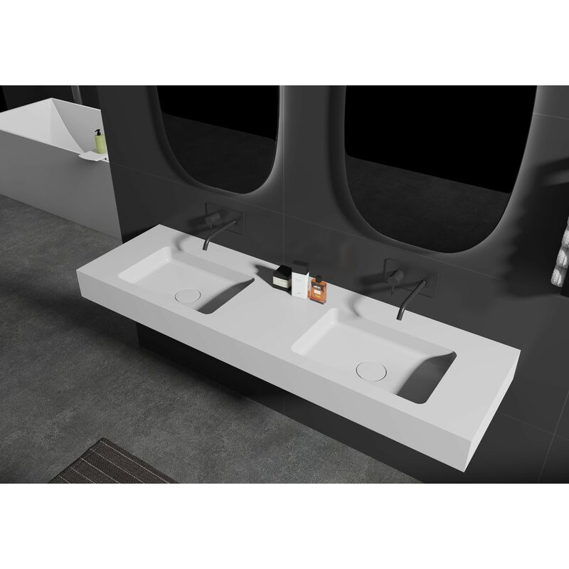 Double Vasque murale suspendue design en fonte minérale pour salle de bain avec bonde et trop plein - 165x45x12 cm - BA8016 - couleur et console
