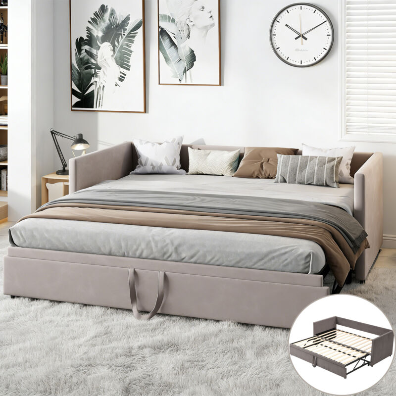 Lit gigogne 90/180x200 cm, canapé-lit extensible avec sommiers à lattes en bois, lits convertible 2 places, lit de repos, avec deuxième lit et cadre