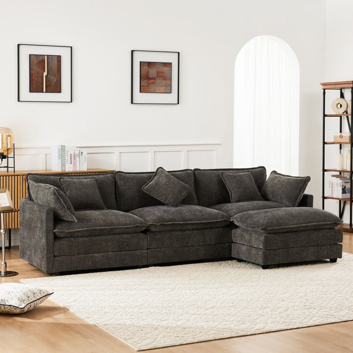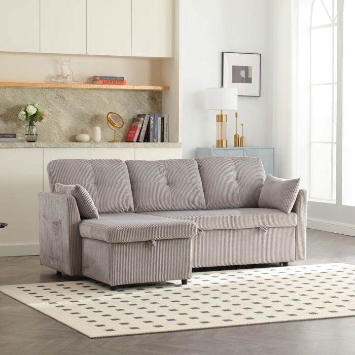 Canapé convertible l-shape avec méridienne, coffre et rangement latéral, gris, lin - meuble pratique