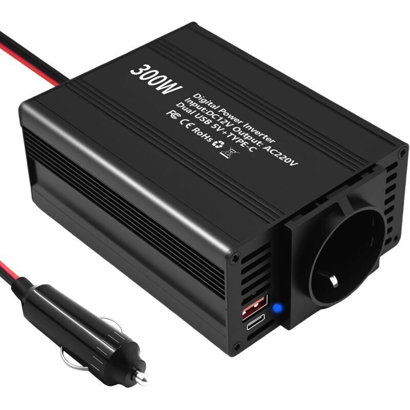 300W Convertisseur 12V 220V 230V Convertisseur de Tension Onduleur Prise Allume Cigare Transformateur de Puissance avec 1 Prises EU, 1 Type-C et 1
