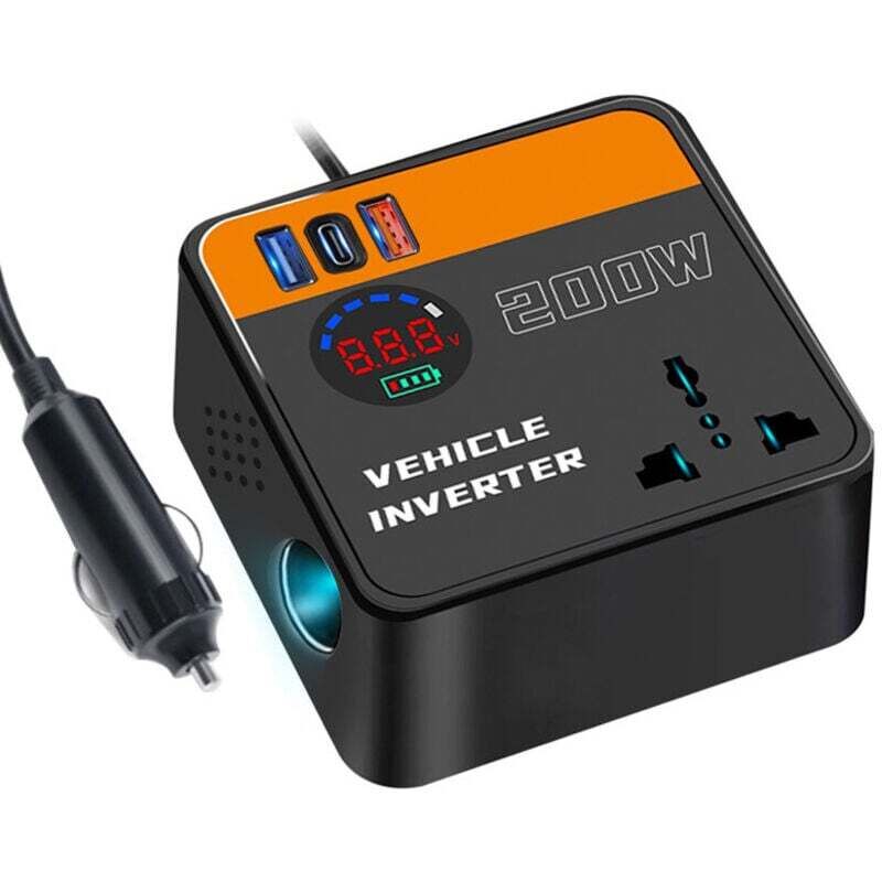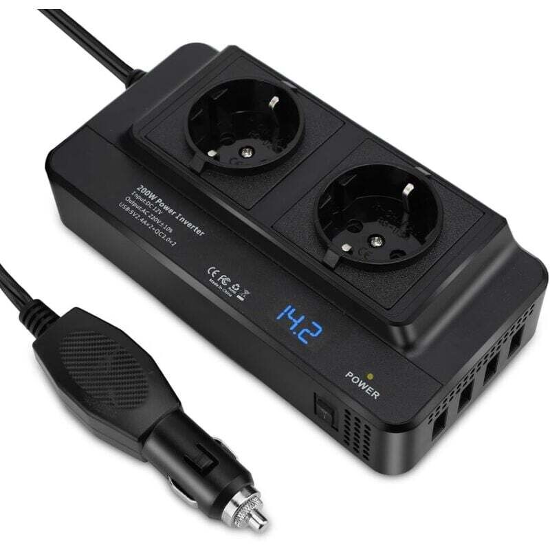 Convertisseur Transformateur Chargeur pour Voiture 12v 220v, 200 W Prise Allume Cigare Onduleur de Voiture Adaptateur avec 4 Ports USB et 2 Prises