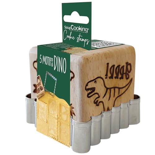 SCRAP COOKING - Tampon Pâtisserie en Bois à Motifs Dinosaure - Avec 1 Découpoir Emporte-Pièce Biscuit & Cube avec 5 Faces Gravées en Relief - Moule Décoration Dino Jungle - 5299