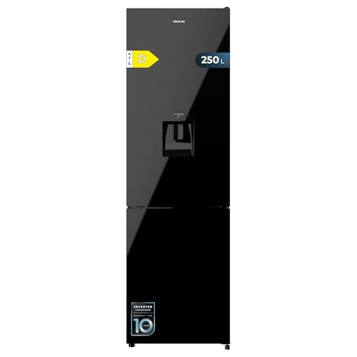 Cecotec Réfrigérateur combiné Bolero CoolMarket Combi 250 WD Black Glass D. Capacité de 250L, classe D, compresseur Inverter, Total No Frost, porte réversible, distributeur d'eau et LED intérieure.