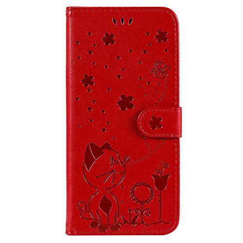 Coque Samsung Galaxy A52S 5G Motif Animaux Chat et Abeille, Étui Housse de Protection Fine Flip Anti-Choc,Pochette en Cuir Portefeuille pour téléphone avec Fonction Debout,Rouge