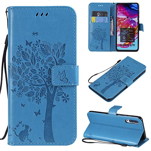 Zchen Coque Samsung Galaxy A70, Etui Pochette PU Cuir Portefeuille Housse Clapet Folio Livre Pliable Couvercle Rabattable pour Samsung Galaxy A70 (Chat-Bleu)