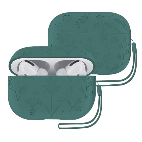 ECZOIL Gravure Coque Compatible avec AirPods Pro 2/1, Fleurs Modèle Silicone Case avec Corde en Silicone pour AirPods Pro 2nd/1st Génération-Vert foncé