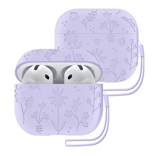 ECZOIL Gravure Coque Compatible avec AirPods 4, Fleurs Modèle Silicone Case avec Corde en Silicone pour AirPods 4th Génération-Violet