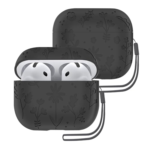 ECZOIL Gravure Coque Compatible avec AirPods 4, Fleurs Modèle Silicone Case avec Corde en Silicone pour AirPods 4th Génération-Gris foncé