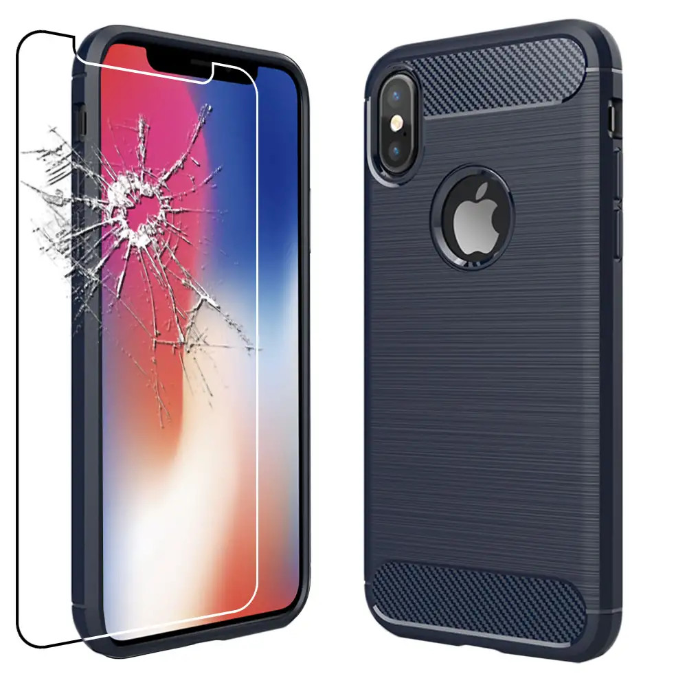Coque Apple iPhone X XS Etui Gel Housse Motif Carbone + VERRE Trempé, Bleu Foncé