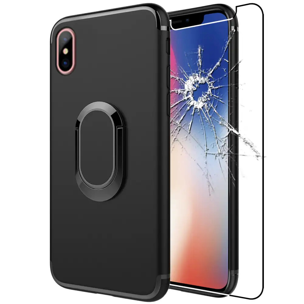 Coque Apple iPhone X XS Etui Housse TPU Support 360 + VERRE Trempé, Noir