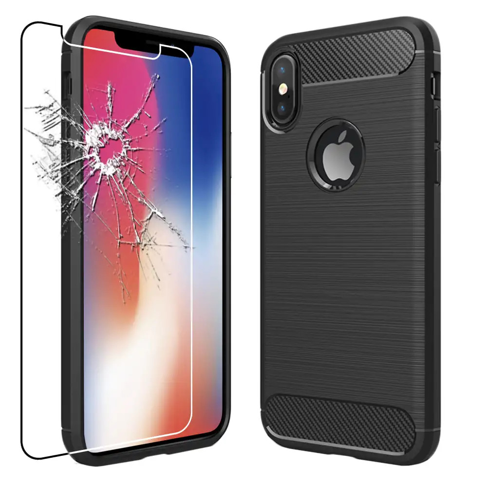 Coque Apple iPhone X XS Etui Gel Housse Motif Fibre Carbone + VERRE Trempé, Noir
