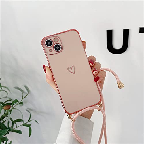 Emlivi Coque de protection pour iPhone 13 - Motif cœur mignon - Coque chaîne, avec bandoulière en nylon - Silicone TPU - Coque de protection galvanisée - Avec cordon de suspension - Pour iPhone 13 -