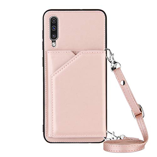 PekaTech Coque avec Cordon pour Samsung Galaxy A50 / A30S / A50S, PU Cuir Silicone Cover avec Fente pour Carte Tour de Cou Lanière, Slim Necklace Case Anti-Choc Bumper Etui Housse & Collier, Rose