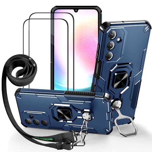Lonjanfon Outdoor Coque avec Cordon pour Samsung Galaxy A25, Support 360°Rotatif, 2 HD Verre Trempé, Militaire Antichoc Housse Etui pour Samsung A25 5G/4G - Bleu