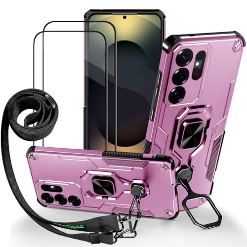 Lonjanfon Outdoor Coque avec Cordon pour Samsung Galaxy S25 Ultra,Support 360°Rotatif,2 HD Verre Trempé, Militaire Antichoc Housse Etui pour Samsung S25 Ultra 5G/4G - Violet