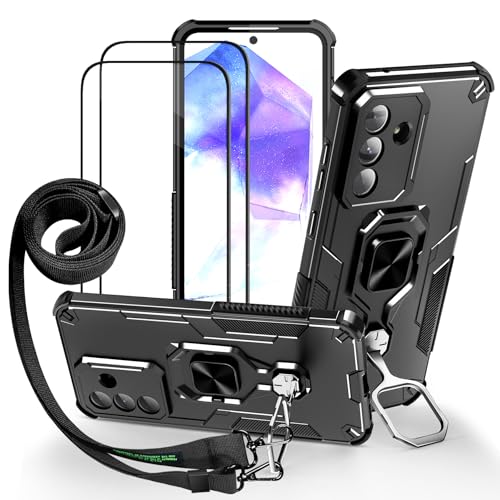 Lonjanfon Outdoor Coque avec Cordon pour Samsung Galaxy A55, Support 360°Rotatif, 2 HD Verre Trempé, Militaire Antichoc Housse Etui pour Samsung A55 5G/4G - Noir