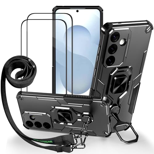 Lonjanfon Outdoor Coque avec Cordon pour Samsung Galaxy S25 FE,Support 360°Rotatif,2 HD Verre Trempé, Militaire Antichoc Housse Etui pour Samsung Galaxy S25 FE 5G/4G - Noir