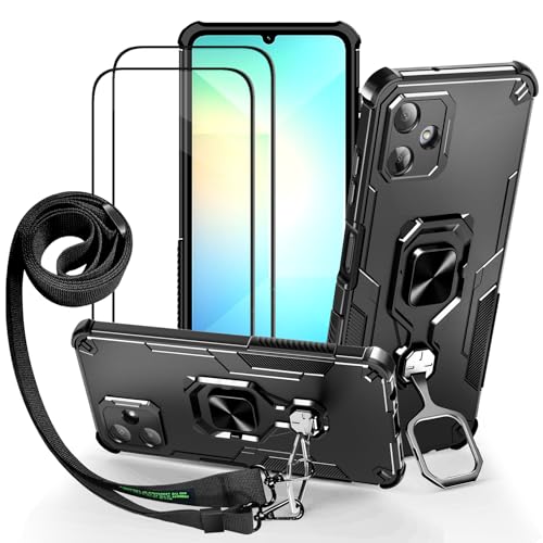 Lonjanfon Outdoor Coque avec Cordon pour Samsung Galaxy A06, Support 360°Rotatif, 2 HD Verre Trempé, Militaire Antichoc Housse Etui pour Samsung A06 5G/4G - Noir