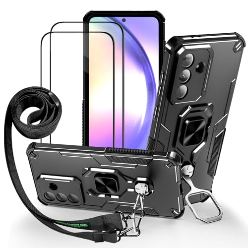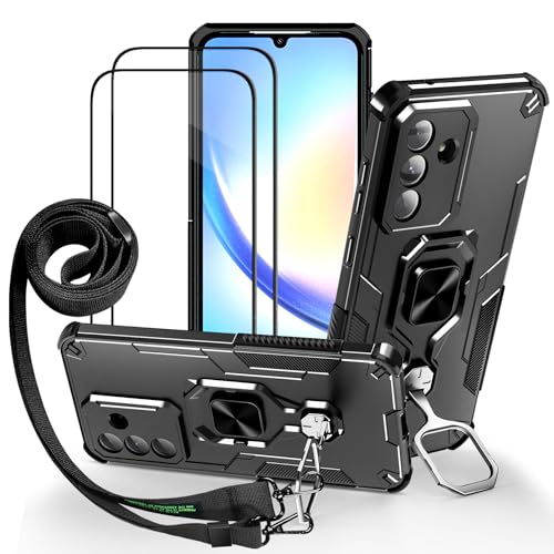 Lonjanfon Outdoor Coque avec Cordon pour Samsung Galaxy A35, Support 360°Rotatif, 2 HD Verre Trempé, Militaire Antichoc Housse Etui pour Samsung A35 5G/4G - Noir