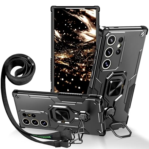 Lonjanfon Outdoor Coque avec Cordon pour Samsung Galaxy S24 Ultra,Support 360°Rotatif, Militaire Antichoc Housse Etui pour Samsung S24 Ultra 5G/4G - Noir