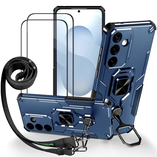 Lonjanfon Outdoor Coque avec Cordon pour Samsung Galaxy S25 FE,Support 360°Rotatif,2 HD Verre Trempé, Militaire Antichoc Housse Etui pour Samsung Galaxy S25 FE 5G/4G - Bleu