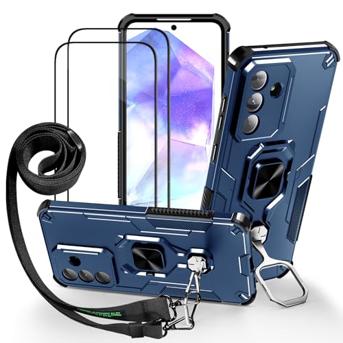 Lonjanfon Outdoor Coque avec Cordon pour Samsung Galaxy A55, Support 360°Rotatif, 2 HD Verre Trempé, Militaire Antichoc Housse Etui pour Samsung A55 5G/4G - Bleu