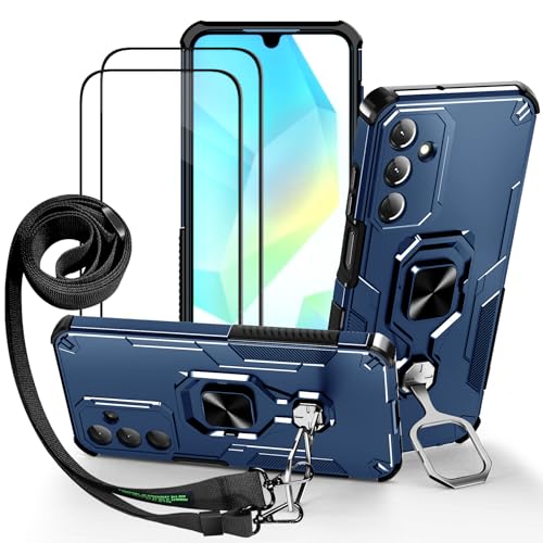 Lonjanfon Outdoor Coque avec Cordon pour Samsung Galaxy A06, Support 360°Rotatif, 2 HD Verre Trempé, Militaire Antichoc Housse Etui pour Samsung A06 5G/4G - Bleu