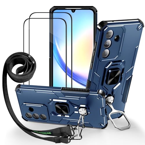 Lonjanfon Outdoor Coque avec Cordon pour Samsung Galaxy A35, Support 360°Rotatif, 2 HD Verre Trempé, Militaire Antichoc Housse Etui pour Samsung A35 5G/4G - Bleu
